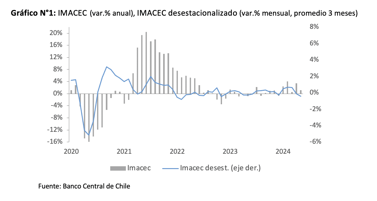 El Banco Central de Chile dio a conocer el Imacec de mayo de 2024, el cual aumentó 1,1% en comparación al mismo mes del año anterior, muy por debajo de lo esperado por el mercado. En terminos desestacionalizados, en tanto, la actividad volvió a disminuir, esta vez en -0,4%.
