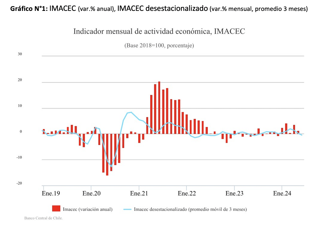El Banco Central de Chile dio a conocer el Imacec de junio de 2024, el cual aumentó 0,1% en comparación al mismo mes del año anterior, ubicándose en el rango bajo de las proyecciones. El hecho de que el mes contó con un día hábil menos que en 2023 contribuyó negativamente el resultado, mientras que la serie desestacionalizada aumento en 0,3%.