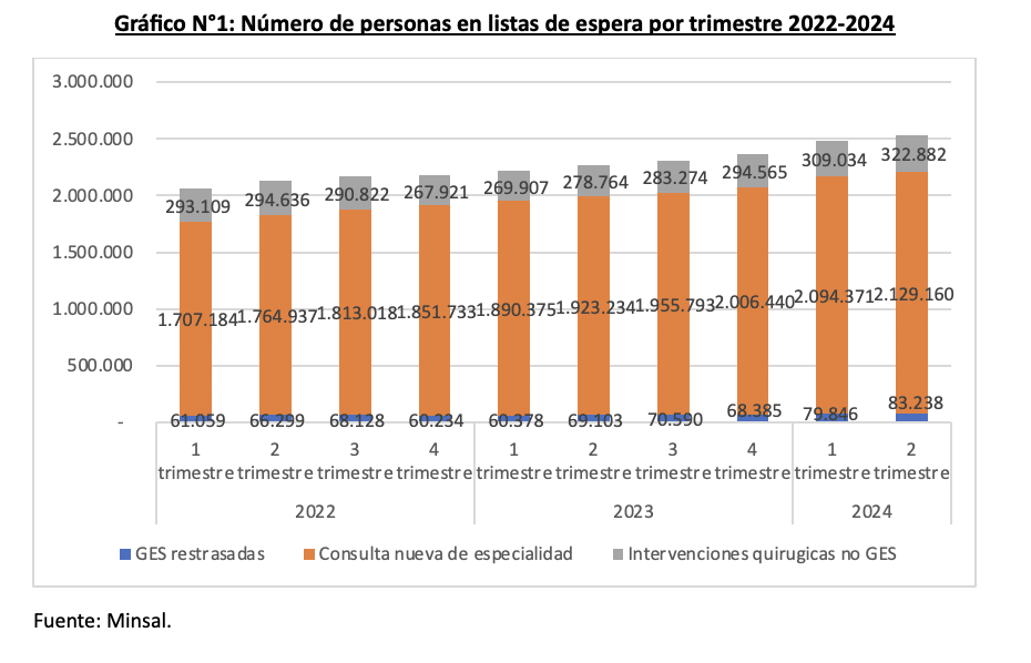 El Ministerio de Salud dio a conocer las listas de espera en salud correspondientes al segundo trimestre de 2024. Las cifras totales dan cuenta de más de 2,5 millones de personas que esperan por atención en la salud estatal, un alza de 12% respecto a igual trimestre de 2023.