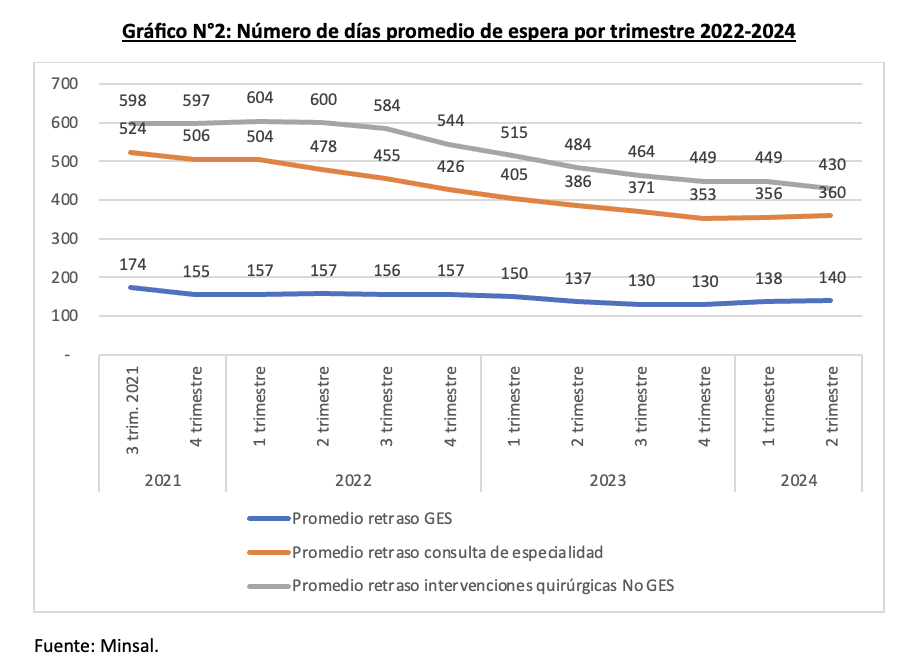 Adicionalmente, las cifras entregadas por el Minsal dan cuenta de una caída en los tiempos de espera promedio si se comparan con el segundo trimestre de 2023 (salvo en el GES que sube de 137 a 140 días promedio), pero si se compara trimestre por trimestre da cuenta de un preocupante quiebre de tendencia donde los tiempos promedios de espera tanto en GES como en consultas de especialidad vuelven a subir (ver Gráfico N°2).