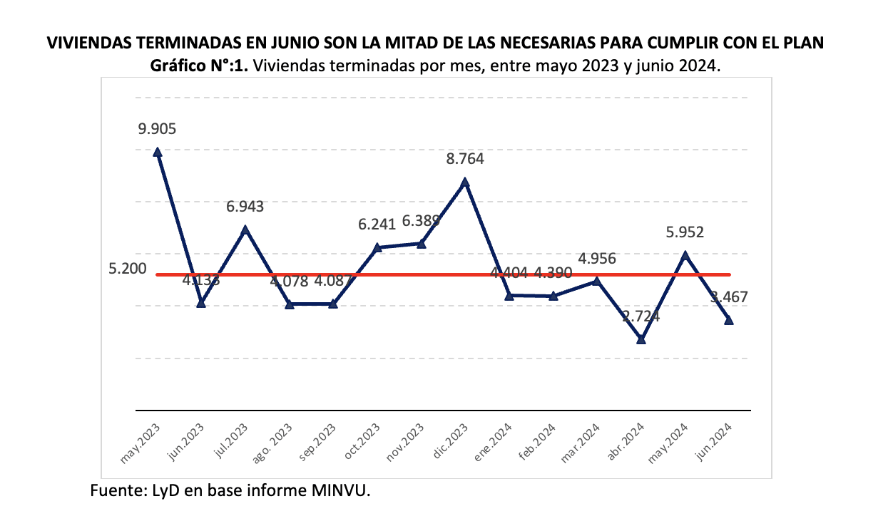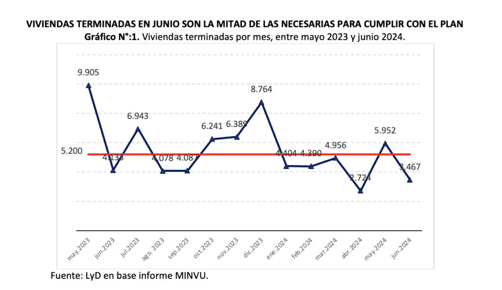 Quedan 21 meses para que se cumpla el compromiso del Plan, que tiene como fecha límite marzo de 2026, y aún se necesitan 133.250 viviendas para alcanzar la meta de 260.000. Para lograr este objetivo se deberían terminar 6.345 viviendas mensuales en los próximos meses, en lugar de las 3.467 viviendas que se terminaron en junio. Por lo tanto, es crucial mejorar la celeridad y eficiencia en los procesos que presenta el ministerio para entregar de viviendas.