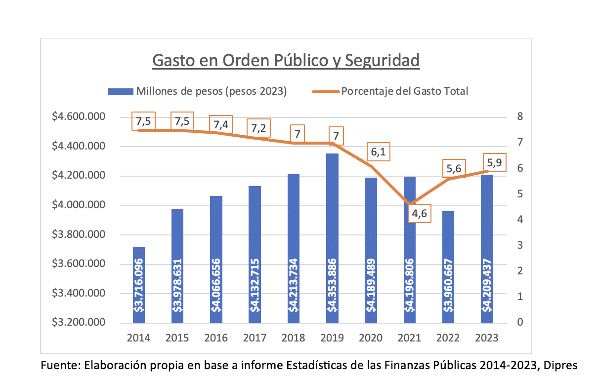 1. Seguridad. El Presidente Boric anunció nuevos aumentos a los recursos destinados a la seguridad pública. En su discurso señaló que el Gobierno ha “revertido con creces el retroceso que hubo en los recursos para la seguridad en los años anteriores”. Sin embargo, las cifras no respaldan esas palabras. Según las cifras del informe Estadísticas de las Finanzas Públicas 2014-2023 de la Dipres, vemos que el gasto en orden y seguridad de los años 2022 y 2023 ha sido inferior al que existía antes de la pandemia. Además, el porcentaje que estas cifras representan respecto al gasto público total se encuentran entre las más bajas de los últimos 10 años (ver gráfico). Esto último es reflejo de que, para la actual administración, el orden y la seguridad no ha tenido la misma prioridad en el gasto público que gobiernos anteriores.