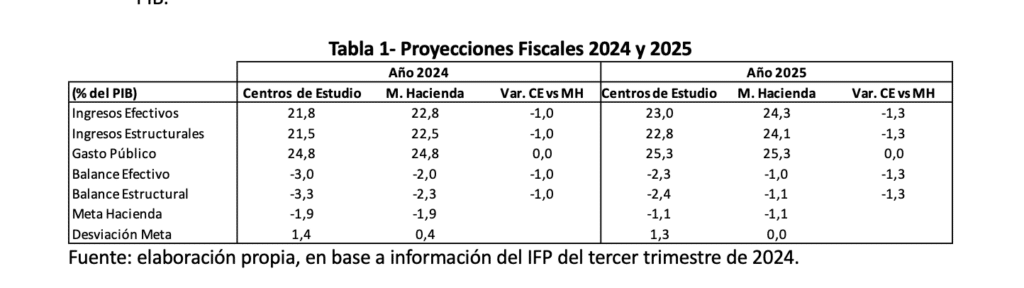 - A pesar de la advertencia de agosto del CFA, el IFP del tercer trimestre presentado recientemente junto a la Ley de Presupuestos 2025, redujo en sólo 0,1% del PIB la estimación de ingresos efectivos para el 2024. No sincerar la menor recaudación esperada de ingresos para el 2024 tiene consecuencias importantes para el cumplimiento de la meta fiscal este año, como también para los ingresos, gastos y deuda estimados para el año 2025.