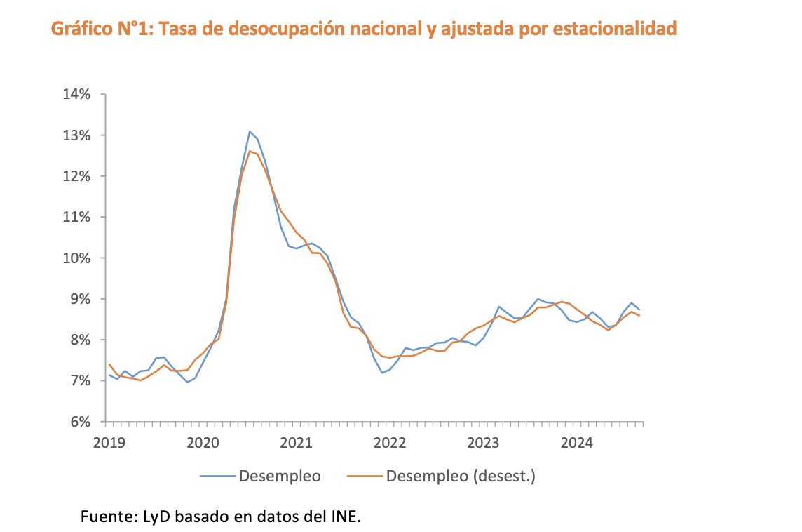 El Instituto Nacional de Estadísticas (INE) dio a conocer las cifras laborales correspondientes al trimestre móvil julio - septiembre 2024. La tasa de desocupación nacional fue de 8,7%, solo 0,2 puntos porcentuales (pp) por debajo del mismo período del año anterior. Esta disminución se explica porque la población desocupada creció 0,3%, cifra que es inferior a la que registran los ocupados que crecen 2,4% en este mismo periodo. Por otro lado, la tasa ajustada por estacionalidad, se ubicó en 8,6%, aumentando 0,2 pp respecto del dato del trimestre anterior (Gráfico N°1).
