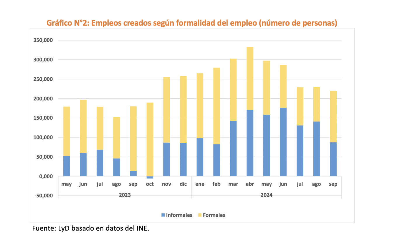 Finalmente, si bien los datos muestran que en este trimestre en particular los empleos creados son mayoritariamente formales, se debe tener cautela con su lectura, pues, no necesariamente significa un cambio permanente en la trayectoria de la composición del empleo, sobre todo considerando las perspectivas económicas. La informalidad sigue siendo preocupante porque de 10 empleos que se crean, 4 son informales. Además, el número total de empleos creados es el más bajo de 2024. Es urgente retomar el camino del crecimiento económico e implementar medidas que permitan generar empleos formales.