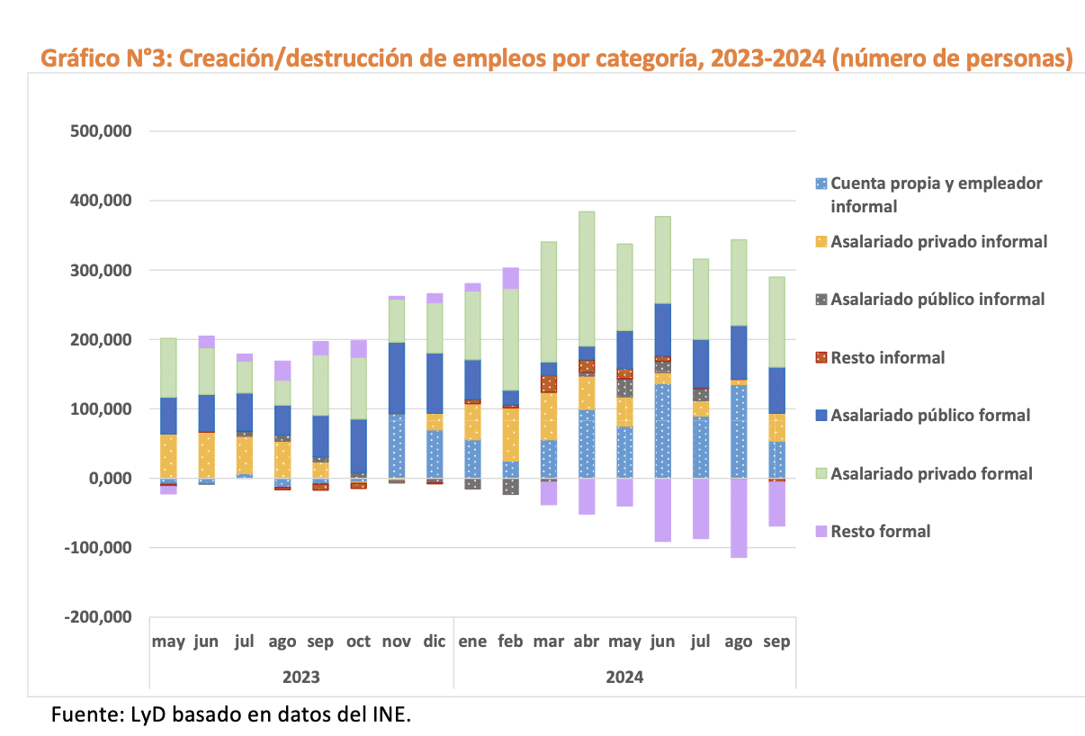Al analizar la composición por categoría del empleo, se observa que la destrucción de empleos informales fue menor a la de registros inmediatamente anteriores, mientras que la creación de trabajos informales por cuenta propia fue más baja, como se observa en el Gráfico Nº 3.