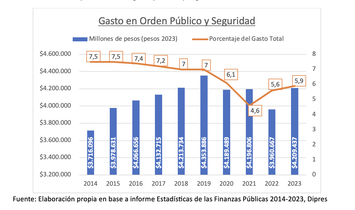 1. Seguridad. El Presidente Boric anunció nuevos aumentos a los recursos destinados a la seguridad pública. En su discurso señaló que el Gobierno ha “revertido con creces el retroceso que hubo en los recursos para la seguridad en los años anteriores”. Sin embargo, las cifras no respaldan esas palabras. Según las cifras del informe Estadísticas de las Finanzas Públicas 2014-2023 de la Dipres, vemos que el gasto en orden y seguridad de los años 2022 y 2023 ha sido inferior al que existía antes de la pandemia. Además, el porcentaje que estas cifras representan respecto al gasto público total se encuentran entre las más bajas de los últimos 10 años (ver gráfico). Esto último es reflejo de que, para la actual administración, el orden y la seguridad no ha tenido la misma prioridad en el gasto público que gobiernos anteriores.
