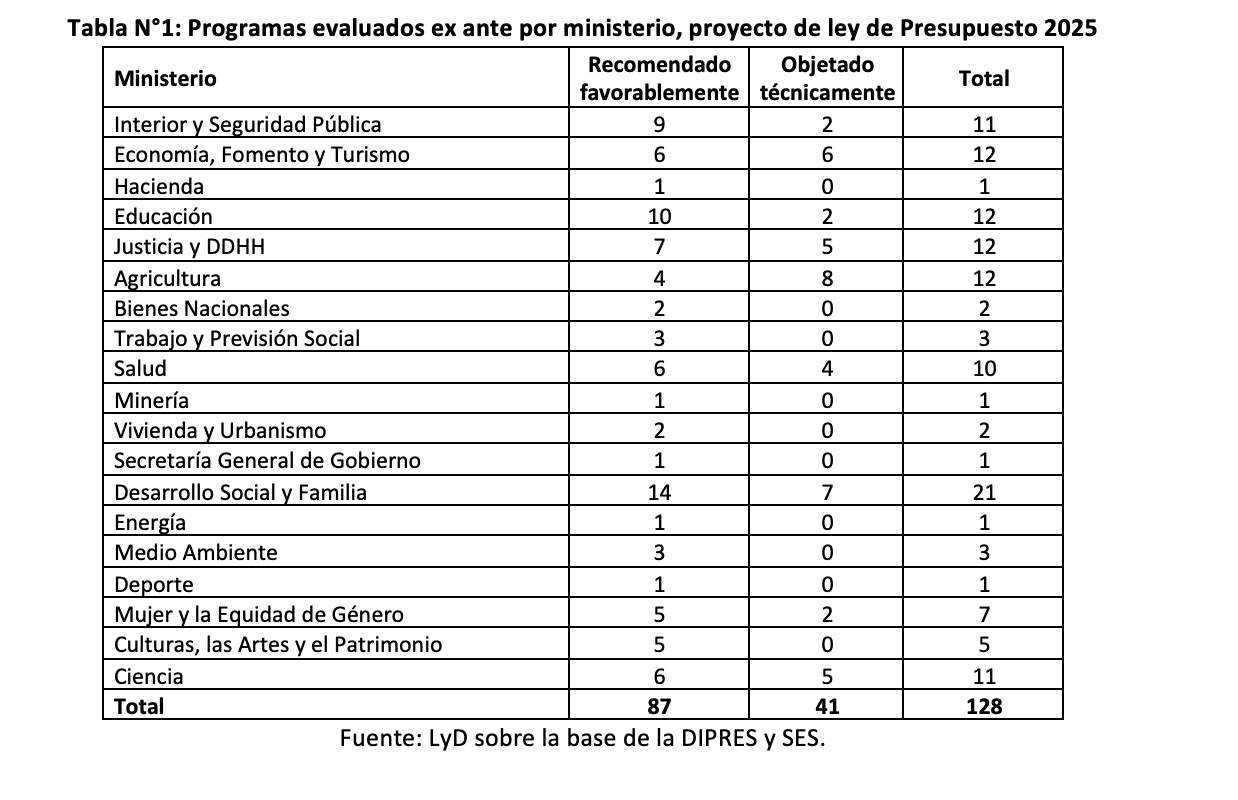 Este año, fueron 128 programas evaluados ex antes, de los cuales, 41 (un 32%) fueron objetados técnicamente. Tal como lo muestra la Tabla N°1, especialmente preocupan los programas objetados que se concentran en los ministerios de Agricultura (8 de 12); Desarrollo Social y Familia (7 de 14); y Economía, Fomento y Turismo (6 de 12).