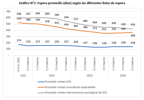 En cuanto a los tiempos de espera, la tendencia descendente postpandemia lamentablemente no se ha mantenido. De hecho, en los casos si se compara con los datos del fin de 2023, los retrasos GES y las consultas de especialidad han aumentado. Solo las intervenciones quirúrgicas han disminuido, pero todavía con tiempos promedios de espera superiores a los 14 meses (Gráfico N°2).