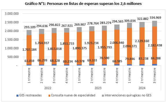 Ese número se desglosa en poco más de 84 mil personas con atenciones GES retrasadas (pese a que hay una garantía legal de atención oportuna), 2,1 millones esperando por ser atendidos por un médico especialista y casi 335 personas esperando por una intervención quirúrgica (ver Gráfico N°1).