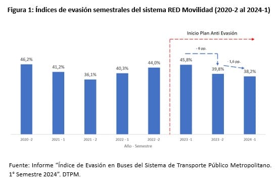 A comienzos de agosto de 2024, el Ministerio de Transportes y Telecomunicaciones (MTT) publicó el índice de evasión del sistema RED Movilidad (sólo mide buses) para el 1° semestre de 2024, el que llegó a un 38,2%, sólo 1,6 puntos porcentuales menos que la evasión del 2° semestre de 2023 (39,8%).