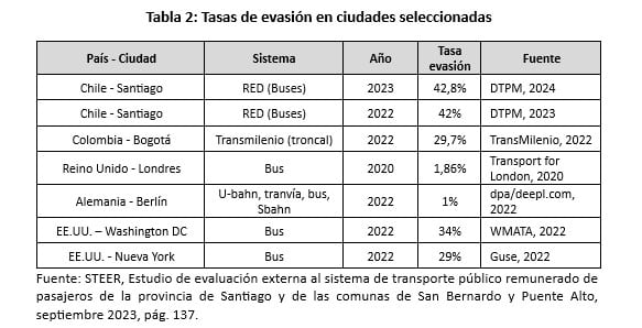 A su vez, es importante recordar que la evasión de RED supera largamente a la reportada por otros sistemas de transportes en el mundo (Ver Tabla 2), y en los hechos, implica que casi un 40% de los usuarios de buses siguen sin pagar su pasaje.