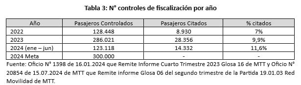 Sumado a lo expuesto, se advierte con preocupación que no exista una meta concreta de reducción de la evasión. Esto impide, una evaluación pública de la efectividad del plan. Las únicas metas cuantitativas asociada al plan para este 2024 es lograr 300.000 fiscalizaciones, lo que equivale a un incremento de sólo un 4,88% de las fiscalizaciones realizadas el 2023 (ver Tabla 3), lograr que un 30% de las transacciones del sistema sean con tecnología QR (a enero de 2024 era el 13% del sistema[v]), que 40 mil personas empleen la recarga automática de la tarjeta Bip! (el 2023 fueron 26.851 usuarios) y realizar 200 charlas educativas en colegios (el 2023 se realizaron 122 charlas)[vi]. Pero nada respecto al objetivo principal del plan, cuánta evasión se espera reducir.