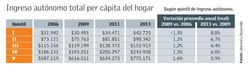 Así, en el período 2009-2013, el ingreso monetario per cápita total (ingreso autónomo más los subsidios estatales) se vio incrementado en términos reales en todos los quintiles de ingresos, pero en mayor medida en los pertenecientes al 20% más pobre de la población, los que se vieron favorecidos por un incremento del 7,4% real anual.