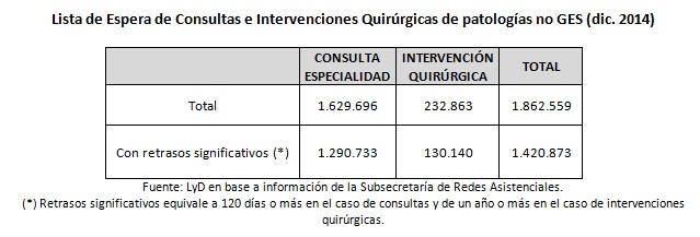 Asimismo, las listas de espera en el sector público tampoco mostraron mejoras sustantivas: para el caso de las patologías no AUGE, en diciembre de 2014 el número de casos en espera de ser atendidos llegó a 1.862.559, 76% de los cuales contempla un retraso significativo (lo que equivale a 120 días o más en el caso de consultas y de un año o más en el caso de intervenciones quirúrgicas). Este número es muy similar al de marzo de 2014 (1.826.630).