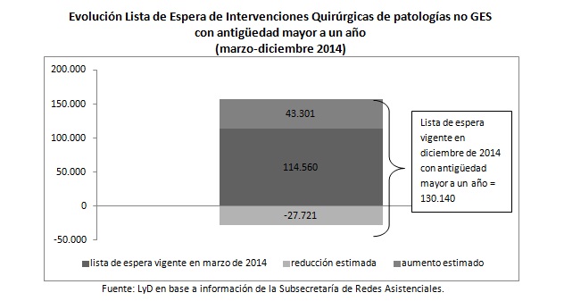 Por su parte, la Subsecretaría de Redes recientemente informó que entre marzo y diciembre de 2014, la lista de espera de intervenciones quirúrgicas con antigüedad superior a un año aumentó desde 114.560 a 130.140 casos (flujos netos). Si suponemos una reducción mensual de las intervenciones vigentes igual a la de la tasa de reducción máxima estimada para el período mayo de 2010-diciembre de 2013, esto querría decir que de las intervenciones quirúrgicas vigentes en marzo de 2014, en septiembre sólo quedarían vigentes 86.839.