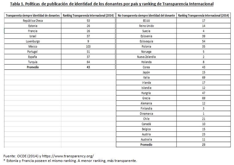 Sin conocer el planteamiento definitivo de la Comisión Engel sobre la materia, un ejercicio sencillo a partir del cruce de datos de la OCDE sobre políticas de publicación por parte de partidos y candidatos de la identidad de los donantes y el Ranking de Transparencia Internacional de 2014 permite visualizar que los países que transparentan siempre la identidad de los donantes de la actividad política no poseen en promedio mejores índices de transparencia según el ranking anual de Transparencia Internacional, como se describe en el siguiente cuadro: