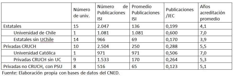 Para argumentar lo anterior, en la tabla a continuación se revisan los indicadores disponibles sobre calidad universitaria en educación superior: años de acreditación y publicaciones ISI[1]. Dentro del CRUCH las universidades estatales tienen un relativamente bajo estándar de calidad, pero además con respecto a las universidades fuera del CRUCH que están suscritas al sistema de admisión vía PSU.