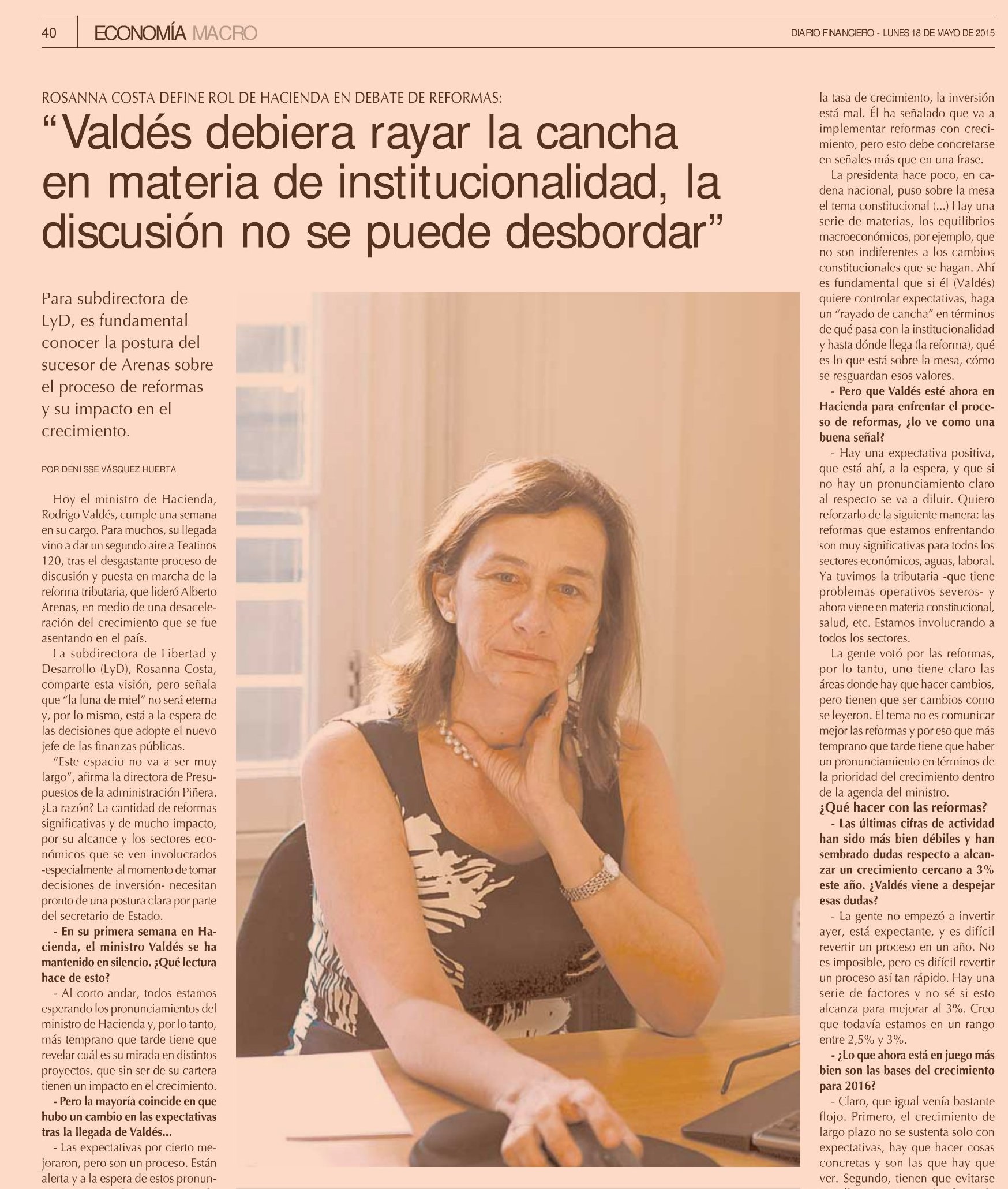 Todos sabemos hoy día que además de otros factores, las expectativas políticas están afectando duramente la tasa de crecimiento, la inversión está mal. Él ha señalado que va a implementar reformas con crecimiento, pero esto debe concretarse en señales más que en una frase. La presidenta hace poco, en cadena nacional, puso sobre la mesa el tema constitucional (...) Hay una serie de materias, los equilibrios macroeconómicos, por ejemplo, que no son indiferentes a los cambios constitucionales que se hagan. Ahí es fundamental que si él (Valdés) quiere controlar expectativas, haga un "rayado de cancha" en términos de qué pasa con la institucionalidad y hasta dónde llega (la reforma), qué es lo que está sobre la mesa, cómo se resguardan esos valores.