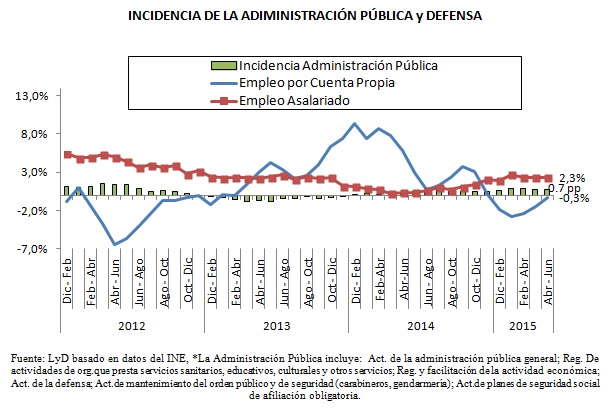 En concreto, la expansión de la ocupación de 1,5% en 12 meses, se explica por un aumento de los empleadores de un 4,6% -pero con escasa incidencia (0,2 puntos)-; un empleo por cuenta propia que retrocede en un 0,3% (mejor el -1,5% del mes anterior); y el empleo asalariado que continúa como el gran motor con un 2,3% de expansión y 1,6 puntos de incidencia, donde, sin embargo, debe notarse que casi un tercio (0,7 puntos porcentuales del 2,3%) de lo creado en los últimos 12 meses corresponde a la rama Administración Pública y Defensa.