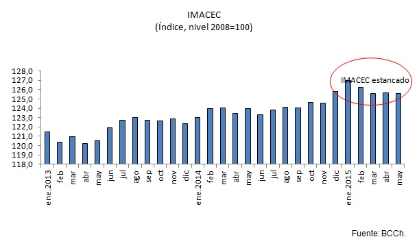 El Banco Central dio a conocer el quinto IMACEC de 2015, el cual registró la peor cifra en lo que va del año con un crecimiento interanual de apenas 0,8%, muy por debajo incluso del decepcionante promedio de los 12 meses previos de 1,8%. Esta cifra se sitúa por debajo de las moderadas expectativas del mercado formadas a partir de lo que adelantaban algunos de los indicadores sectoriales conocidos a fines de junio, donde nuevamente destacaba el retroceso real de la minería (-0,4%) y la manufactura (-3,3%).