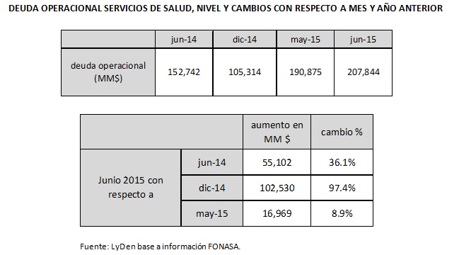 La deuda operacional de los servicios de salud en junio de 2015 superó el umbral de los $200 mil millones, alcanzando un valor total de $207.844 millones. Este valor es $16.969 millones superior a la deuda registrada en mayo pasado y $102.530 millones más alta a la deuda de diciembre de 2014. A su vez, supera en cerca de 36% la deuda registrada el mismo mes del año anterior.