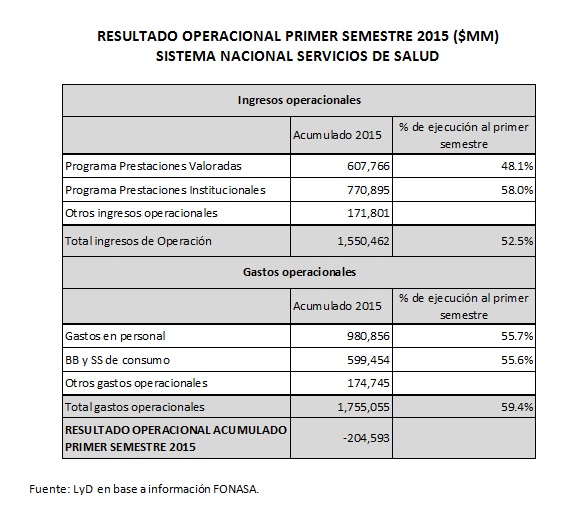 La deuda se explica por un resultado operacional negativo (déficit operacional) a junio de 2015 de $204.593 millones. Al analizar el resultado operacional del primer semestre, vemos que mientras los ingresos se han ejecutado en 52,5%, durante la primera mitad del año la ejecución del gasto ha sido de 59,4%. Llama la atención la subejecución (respecto del umbral de 50%) de los ingresos por el programa de prestaciones valoradas, en contraste con la sobrejecución del ingreso por prestaciones institucionales (que son aquellas que se realizan en establecimientos de la red pública).