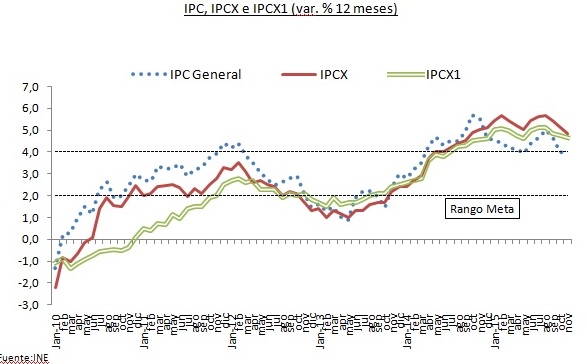 El Instituto Nacional de Estadísticas (INE) dio a conocer el registro para noviembre del Índice de Precios del Consumidor (IPC), el cual no registró variación mensual alguna, por debajo de las expectativas del mercado, recogidas tanto de la Encuesta de Expectativas Económicas (EEE) como en la Encuesta de Operadores Financieros (EOF), ambas realizadas por el Banco Central de Chile (BCCh), que anticipaban un 0,1%.