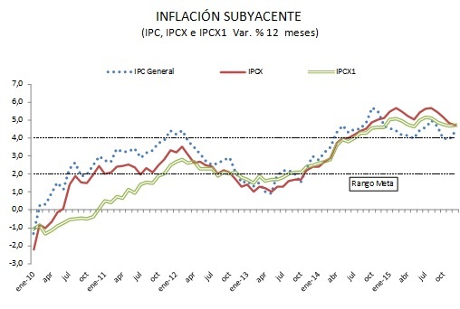Debe considerarse que pese a que el resultado se situó algo por debajo de las expectativas, la preocupación respecto a una inflación por sobre el rango meta aún se mantiene. Los indicadores subyacentes, aquellos que excluyen los productos más volátiles y que por lo tanto pueden entregar una idea más clara del comportamiento de tendencia de la inflación más allá de la coyuntura, siguen mostrando variaciones en doce meses superiores al índice total. De hecho, si no fuera por el shock a la baja que enfrentamos en los precios de los combustibles, la inflación estaría más cerca de 5% que del 4,4% registrado. La fuerza con la que se ha depreciado el peso frente al dólar explica en un grado importante los registros durante el año, y el traspaso del tipo de cambio a precios internos es un proceso que puede mantener la inflación alta durante el primer semestre del año en curso. En la segunda mitad del año, suponiendo mayor estabilidad en el tipo de cambio, esperamos que la inflación en doce meses caiga finalmente dentro del rango objetivo del Banco Central. En esto va a colaborar también la moderación que empieza a observarse en materia de crecimiento de remuneraciones, una política fiscal menos expansiva yun gasto privado que probablemente se mantendrá deprimido.