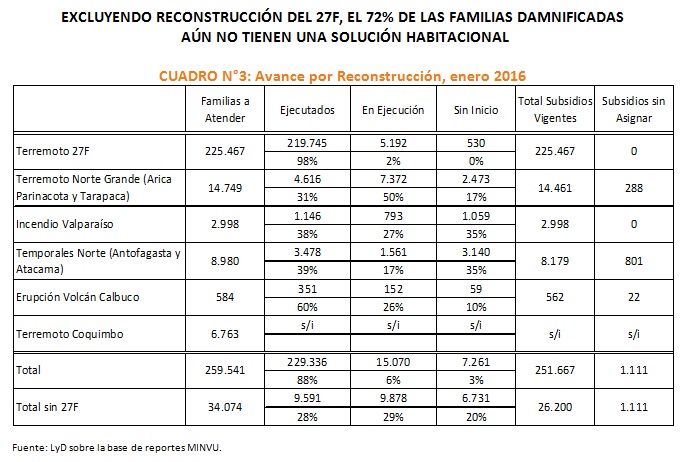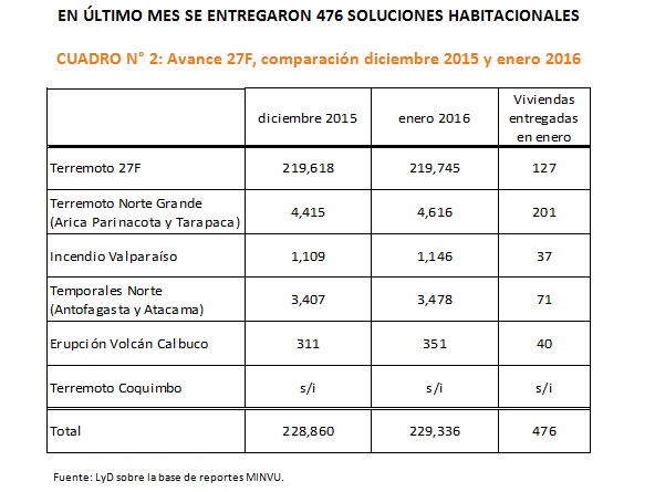 Se observa, al considerar todas las catástrofes, un 88% de las viviendas habían sido entregadas. Sin embargo, cuando se excluye el Terremoto 27F el avance sería un 28% (72% aún no tiene solución habitacional). Esto se debe a que el terremoto 27F tiene un 97% de avance, mientras que el Sismo en el Norte Grande presentó un 31% de avance; el Incendio de Valparaíso un 38%; los temporales en el Norte un 39%; la Erupción en el Volcán Calbuco un 60%; y el Terremoto de Coquimbo no presenta información del estado de avance.