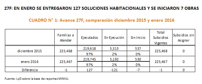 En cuanto al 27F, es posible observar que durante enero fueron entregadas 121 soluciones habitacionales y 7 obras fueron iniciadas. De las 530 obras que aún no han iniciado, 106 (un 20% de los casos) corresponde a la comuna de Coronel de la provincia de Concepción en la región del Biobío. Durante este mes una familia habría renunciado al subsidio asignado[1].