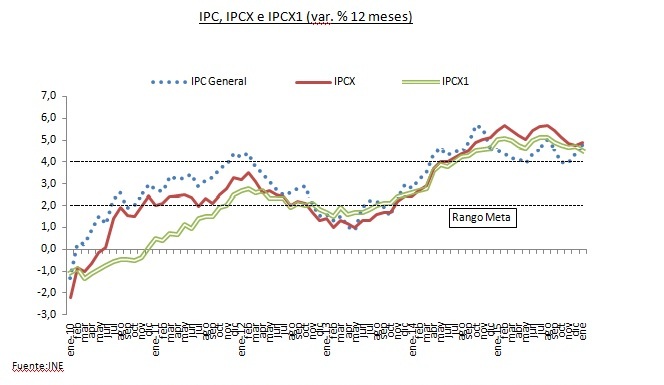 En cuanto a las cifras de las medidas de inflación subyacente, el IPCX, que excluye combustibles, frutas y verduras frescas, experimentÓ una variación de 0,7% con respecto al mes anterior, por encima del IPCX1 (0,4%), que corresponde al IPCX menos carne y pescados frescos, tarifas reguladas de precios indexados y servicios financieros. Como resultado de lo anterior, la inflación subyacente, IPCX, aumenta con respecto al mes previo, alcanzando un 4,9% interanual, mientras que el IPCX1 disminuye un tanto llegando a un aún elevado 4,5%. El IPC SAE, que excluye alimentos y energía, y que es uno de los indicadores más seguidos a nivel internacional aumenta una decima, alcanzando un 4,8%.
