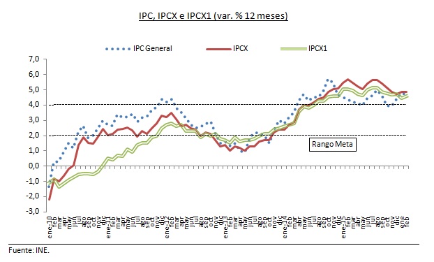 En cuanto a las cifras concretas para las medidas de inflación subyacente, el IPCX, que excluye combustibles, frutas y verduras frescas, experimentó una variación de 0,6% con respecto al mes anterior, por encima del IPCX1 (0,5%), que corresponde al IPCX menos carne y pescados frescos, tarifas reguladas de precios indexados y servicios financieros. Como resultado de lo anterior, la inflación subyacente, IPCX, se mantuvo con respecto al mes previo, alcanzando un 4,9% interanual, mientras que el IPCX1 aumenta un tanto llegando a un elevado 4,6%. El IPC SAE, que excluye alimentos y energía, y que es uno de los indicadores más seguidos a nivel internacional aumentados decima, alcanzando un 5,0%.