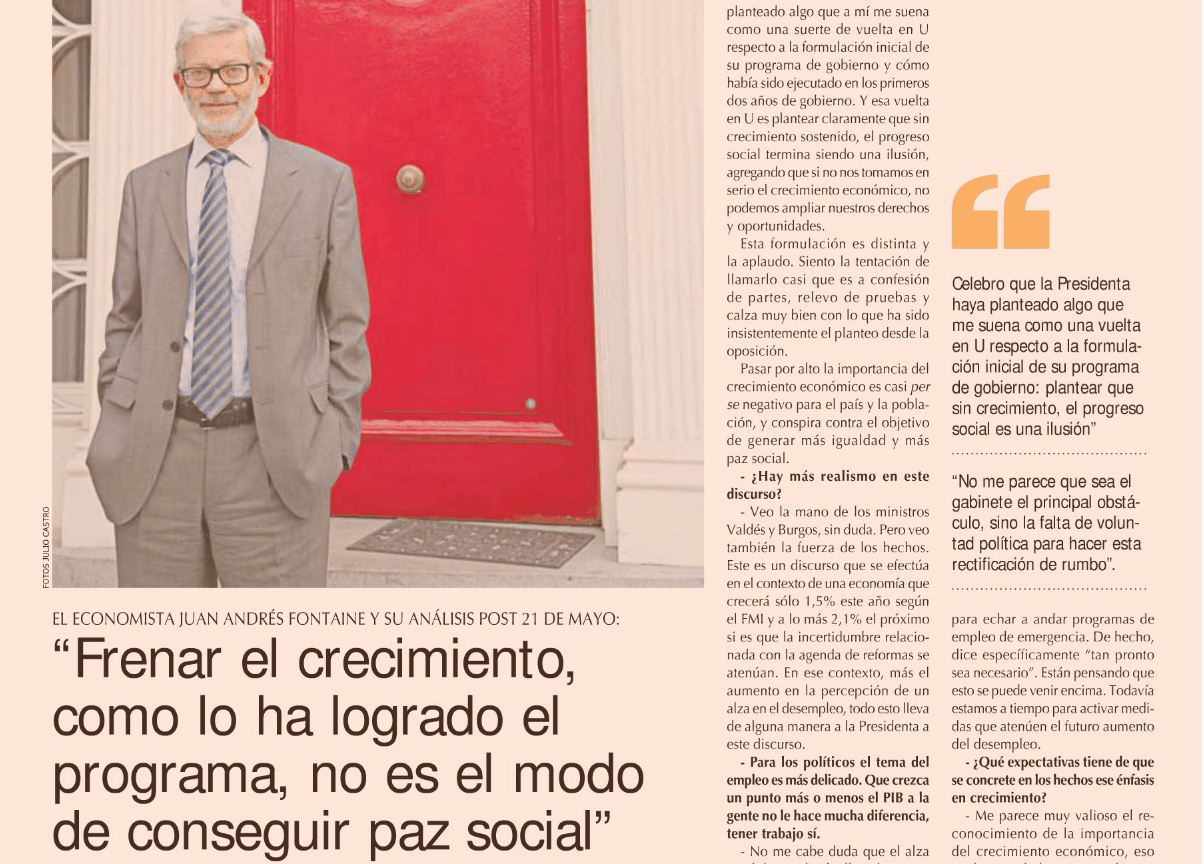 Juan Andrés Fontaine siguió con especial atención el discurso de la Presidenta Bachelet el 21 de mayo en Valparaíso. El ex ministro de Economía reconoce que tenía altas expectativas respecto a la cuenta pública de la jefa de Estado, considerando que se anticipaba un foco en medidas para reactivar la economía.