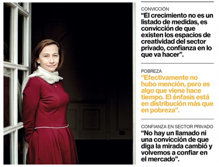 —Sí, porque el crecimiento no es un listado de medidas, es convicción de que existen los espacios de creatividad del sector privado, confianza en lo que va hacer. Si bien hay un reconocimiento y frases bien valiosas de que sin crecimiento no hay desarrollo social, cuando llegamos a lo concreto, esto queda en la agenda de productividad, programas de viviendas, obras de concesiones, embalses, alianzas público-privadas, pero la invitación se queda ahí y no vuelve aparecer el sector privado pujante. No hay un llamado ni una convicción de que diga la mirada cambió y volvemos a confiar en el mercado.