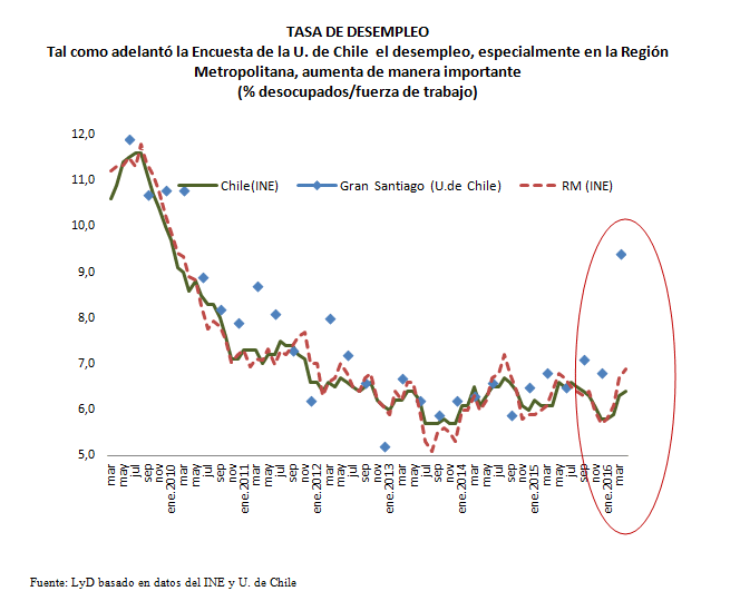 Francisco Klapp, investigador del Programa Económico de Libertad y Desarrollo, explica que aunque la tasa de desempleo a nivel nacional no ha aumentado con la fuerza que la Encuesta de Desempleo de la U. de Chile adelantaba –y que tantas alarmas prendió-, en el Gran Santiago (donde se toma la mencionada encuesta) sí se han visto importantes aumentos del número de desocupado por sobre el 6% anual y una tasa de desempleo que hoy alcanza el 7%.