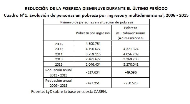 No obstante, aún persisten más de 2 millones de personas en situación de pobreza por ingresos y más de 3 millones en situación de pobreza multidimensional. De las cifras también se desprende que ha disminuido la reducción de la pobreza: anualmente entre 2013 y 2015 nuestro país reduce 217.634 y 49.596 personas en situación de pobreza por ingreso y pobreza multidimensional. Mientras que en el período 2009 y 2013, la disminución anual alcanzó 427.251 y 250.523 personas, respectivamente (Cuadro N° 1).