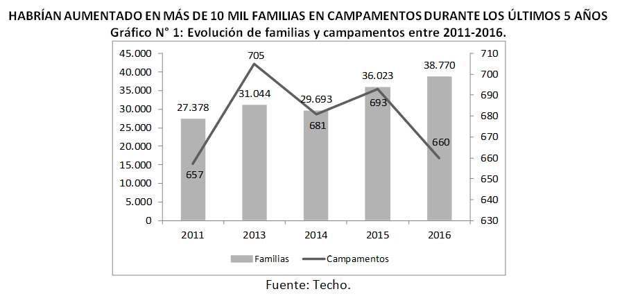 Una alarmante situación reflejan las cifras de Techo Chile, en 5 años habrían aumentado en más de 10 mil las familias en campamento, de 27.378 a 38.770 entre 2011 y 2016. Durante ese mismo periodo, el número de campamentos habrían aumentado de 657 a 660, siendo las regiones más críticas las de Valparaíso, Antofagasta y Atacama (Gráfico N° 1).