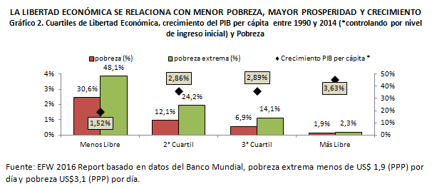 Se destaca que entre el 25% de los países mejor ubicados en el ranking, el ingreso promedio del 10% más pobre era de US$ 11.283 en 2014, comparado con tan solo US$ 1.080 para aquellos que habitan las economías menos libres. En promedio, el 10% más pobre de las naciones más libres son más de dos veces más prósperos que la persona promedio de los países con la menor libertad económica. En términos de pobreza la situación es similar: