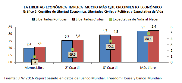 Más aún, nuevamente clasificando en cuartiles de acuerdo al nivel de libertad económica, se observa una enorme correlación positiva con mayores Derechos Políticos y Libertades Civiles de acuerdo al Estudio de Freedom House, Freedom in the World. Lo mismo ocurre incluso para algo tan básico como expectativas de vida.