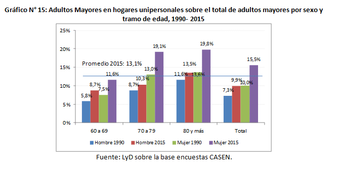 En cuanto a los hogares unipersonales, se observa un aumento desde 1990. El 2015, 13,1% de los adultos mayores vive en un hogar unipersonal. En el caso de las mujeres, los adultos mayores viviendo solo aumento de 10% a 15,5% entre 1990 y 2015. Y en los hombres, de 7,3% a 9,9% en ese mismo período de tiempo (Gráfico N°15).