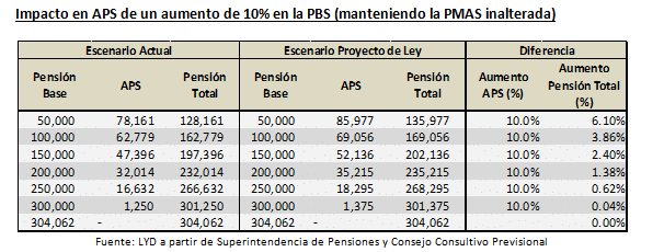 Aumentar en un 10% el PBS de vejez a partir del 1 de enero de 2017, beneficiaría directamente en torno a 1,4 millones de personas, pues implica un aumento en la PBS de invalidez y naturalmente afecta también el cálculo del Aporte Previsional Solidario, que reciben como complemento quienes habiendo cotizado no logran autofinanciar una pensión superior a los $ 304.062.