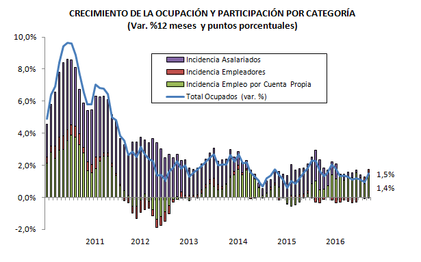 En concreto, la expansión de la ocupación de 1,5% en 12 meses, se explica, al igual que el trimestre anterior por un positivo aumento de los empleadores de un 7,8% -con una incidencia de 0,3 puntos-; un empleo por cuenta propia que crece un 7,0% incidiendo 1,4 puntos, es decir una fracción importantísima de la expansión de la ocupación; y empleo asalariado con un retroceso marginal y prácticamente nula incidencia.