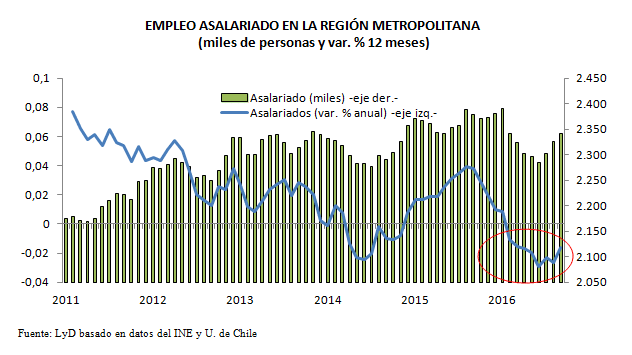 El Instituto Nacional de Estadísticas (INE) dio a conocer la tasa de desempleo correspondiente al trimestre agosto-octubre de 2016, de un 6,4% a nivel nacional, cifra cuatro décimas menor que el trimestre móvil pasado pero una décima mayor que el mismo periodo de 2015. Si bien este nuevo resultado es bastante mejor de lo que adelantaba el mercado, que apuntaba más bien a una mantención, la composición de los empleos que se están creando es preocupante, situación aún más evidente en la Región Metropolitana.
