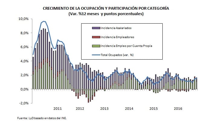 En concreto, la expansión de la ocupación de 1,6% en 12 meses, se explica (al igual que el trimestre anterior por un positivo aumento de los empleadores de un 3,5%) con una incidencia de solo 0,1 punto-; un empleo por cuenta propia que crece un 5,2% incidiendo 1,1 punto, es decir una fracción importantísima de la expansión de la ocupación; y empleo asalariado con un pequeño avance de 0,6% y una incidencia de 0,4 puntos.