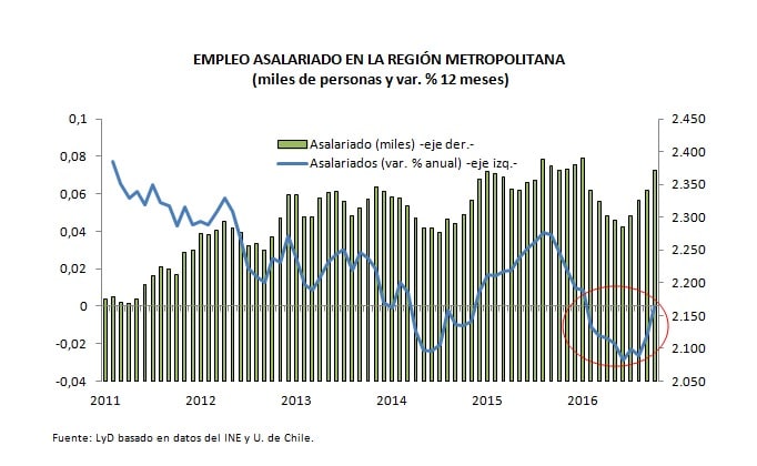 A nivel de la Región Metropolitana, este fenómeno -la contracción del empleo asalariado- venía ocurriendo desde ya algunos meses, pero también parece detenerse y al menos estancarse en el último trimestre móvil.