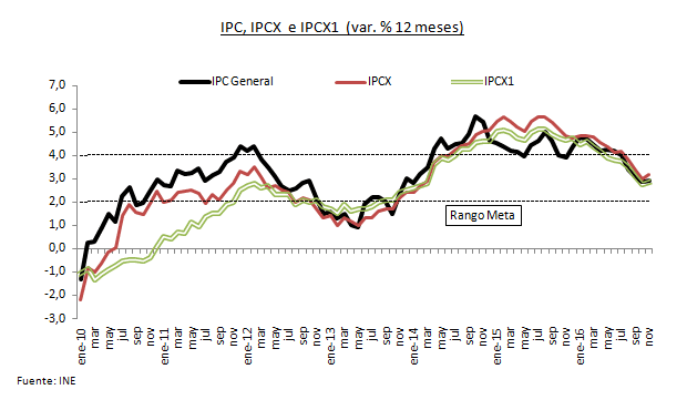 El Instituto Nacional de Estadísticas (INE) dio a conocer el Índice de Precios al Consumidor (IPC) para el penúltimo mes del año 2016, el cual registró una variación respecto a octubre de tan solo 0,1%. Cifra marginalmente por encima de las expectativas del mercado, recogida en la última Encuesta de Operadores Financieros (EOF), pero en línea con la Encuesta de Expectativas Económicas (EEE), ambas realizadas por el Banco Central de Chile (BCCh), que adelantaban una variación de 0% y 0,1% respectivamente.