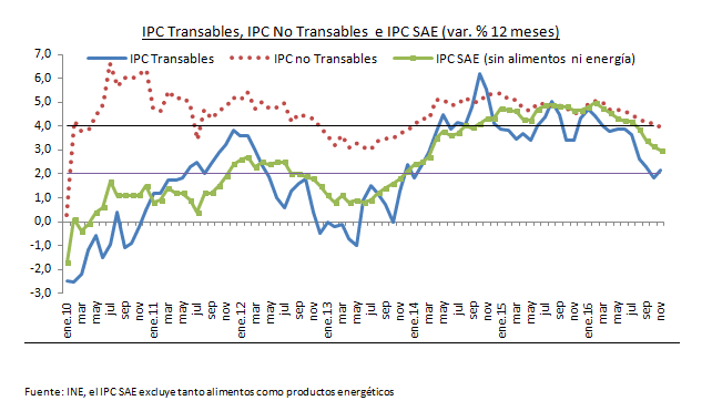 En cuanto a las bajas, Vestuario y Calzado vuelve a dominar, consolidándose como la división que mayores bajas acumula en 2016. Luego de la reciente contracción de 1% respecto a octubre, acumularía 2,2% de retroceso respecto a igual mes de 2015. La segunda baja más relevante corresponde a Transporte, y aquí vale la pena recordar que si bien en los últimos dos meses tuvimos alzas relevantes de esta división con un marcado componente estacional de los pasajes durante las fiestas patrias y los feriados, ésta ha venido registrando disminuciones en sus precios y ayudando a la convergencia. La variación acumulada en el año del precio del Transporte es aún negativa (-1,7%), y el nivel actual del crudo pareciera más alineado con su precio de largo plazo, por lo que no se esperarían grandes alzas, más allá de los habituales ruidos geopolíticos y el riesgo cambiario.