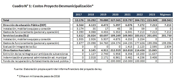 En el informe financiero del proyecto de ley (Cuadro N° 1) se calcula un mayor gasto en régimen de $ 208.943 millones ($ 7.213 millones para financiar el funcionamiento de la nueva Dirección de Educación Pública y $201.730 millones para los 68 SLE que estarán a cargo de los más de 5 mil establecimientos municipales que hoy funcionan).