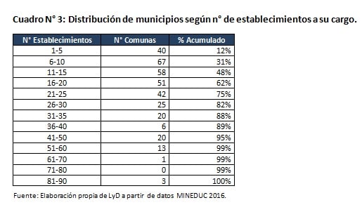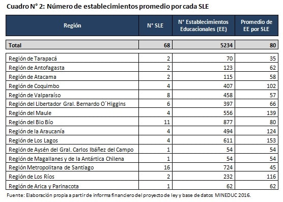 Y por último, el proyecto propone la creación de SLE que estarán a cargo de un promedio de 80 establecimientos, y 18 SLE deberán tener a su cargo más de 100 (ver Cuadro N° 2). Estos tamaños son completamente desproporcionados con la situación actual, en que el 89% de los municipios administra menos de 40 establecimientos (ver Cuadro N° 3). El municipio con más establecimientos a su cargo tiene apenas 89 (Ovalle), y sólo existe en Chile un sostenedor (que es particular) con más de 100 establecimientos, el Magisterio de la Araucanía con 136.